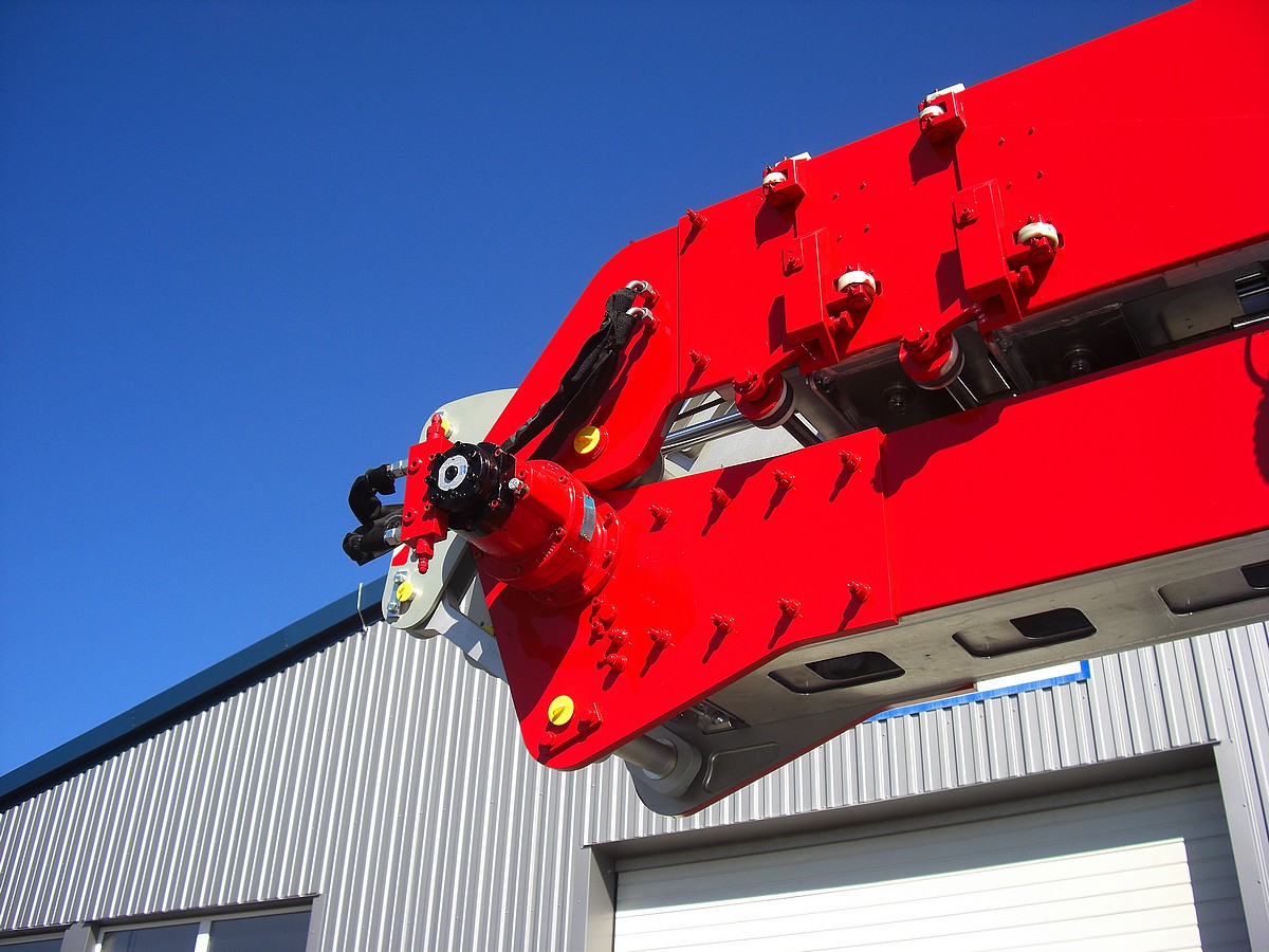 Grundausleger aus hochfester Spezial-Aluminiumlegierung, stufenlos hydraulisch teleskopierbar, Klappspitze 5,00 m (1.600 kg), ausziehbar auf 8,05 m (800 kg) und 10,50 m (500 kg), Klappspitzenverlängerung kann per Funkfernbedienung ausgefahren werden! Vollhydraulische Abstützungen.